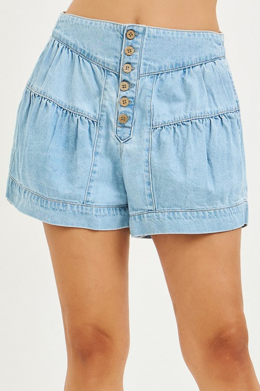 Slouchy denim shorts with shirring detail, front buttons, and side pockets.