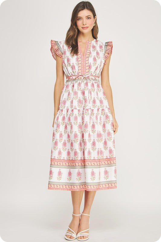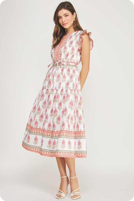 Pleated, cap sleeve, poplin midi dress in a floral block border print.