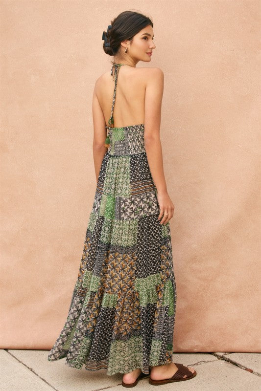 Border print, halter maxi dress with a triangle bust, smocked waist, side pockets, and an open back.