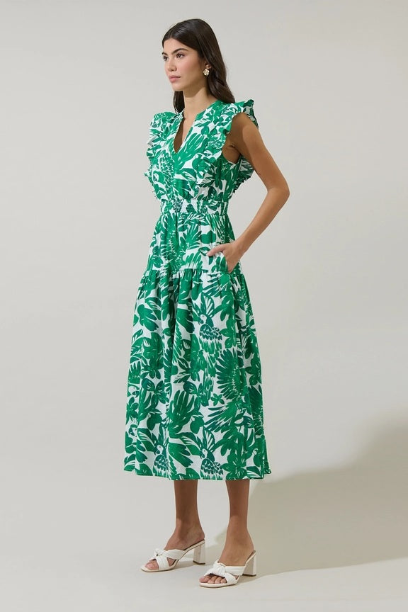 Floral, smocked waist midi dress with ruffle cap sleeves.
