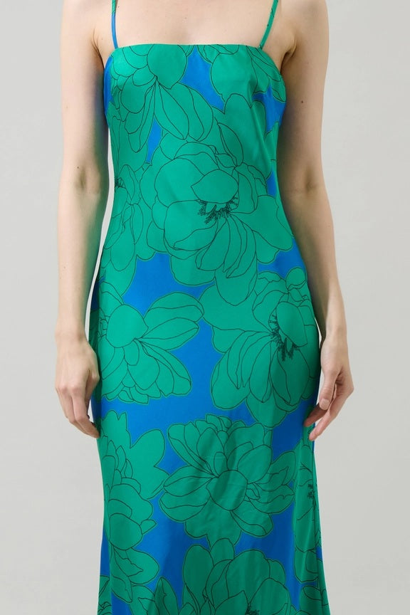 Sleeveless, floral print maxi dress with adjustable spaghetti straps and a straight neckline for a seamless fit.