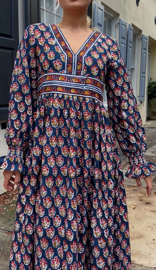 *PREORDER ONLY* Long sleeve, tiered maxi dress with ruffled cuffs, a v-neckline, contrast border detail and a fun floral print.
