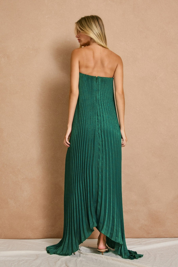 The Moonlit Pleated Maxi is a strapless satin maxi dress with pleated details and high-low sides.
