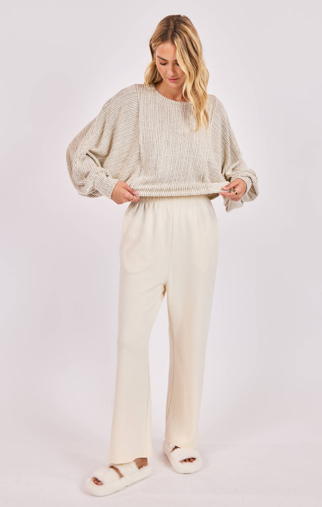 Super soft, striped, textured dolman sleeve top.