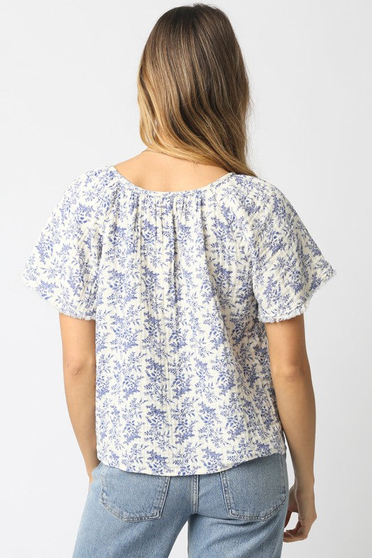 Crinkled, lightweight cotton top with short sleeves, a gathered neckline, and a floral print.