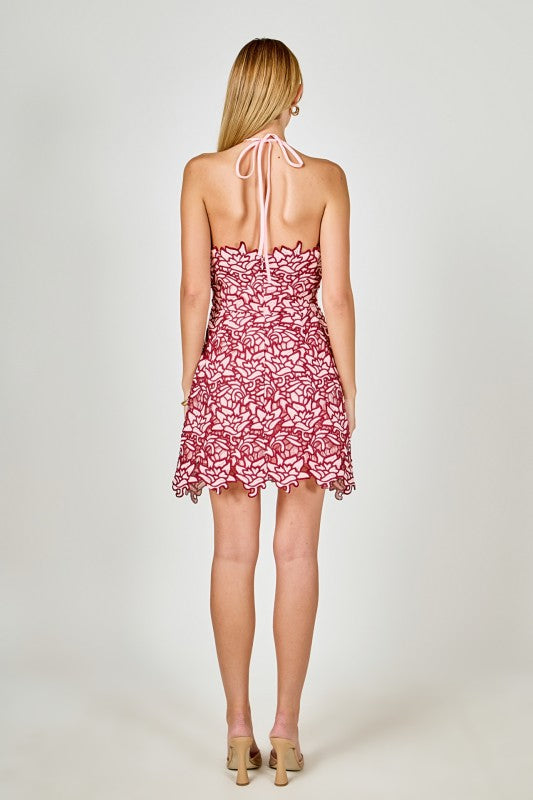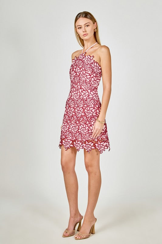 Halter neck mini dress featuring a stunning floral lace design throughout and a cute back bow tie.